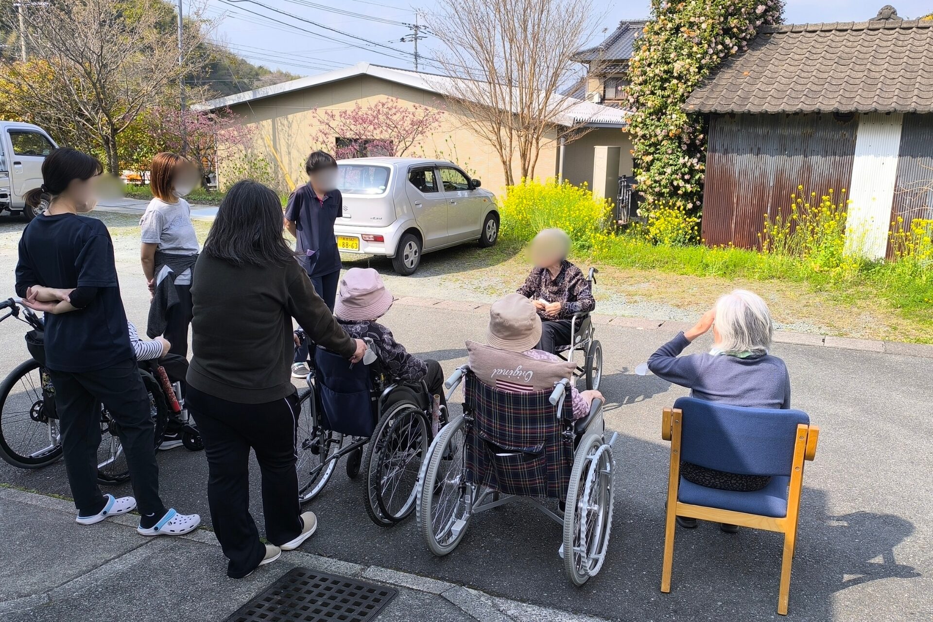 看護小規模多機能ホームのメンバー(ご利用者様・職員)たちは、気持ちよさそうに外に集まっていました。