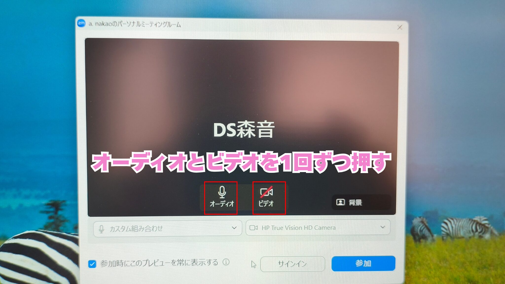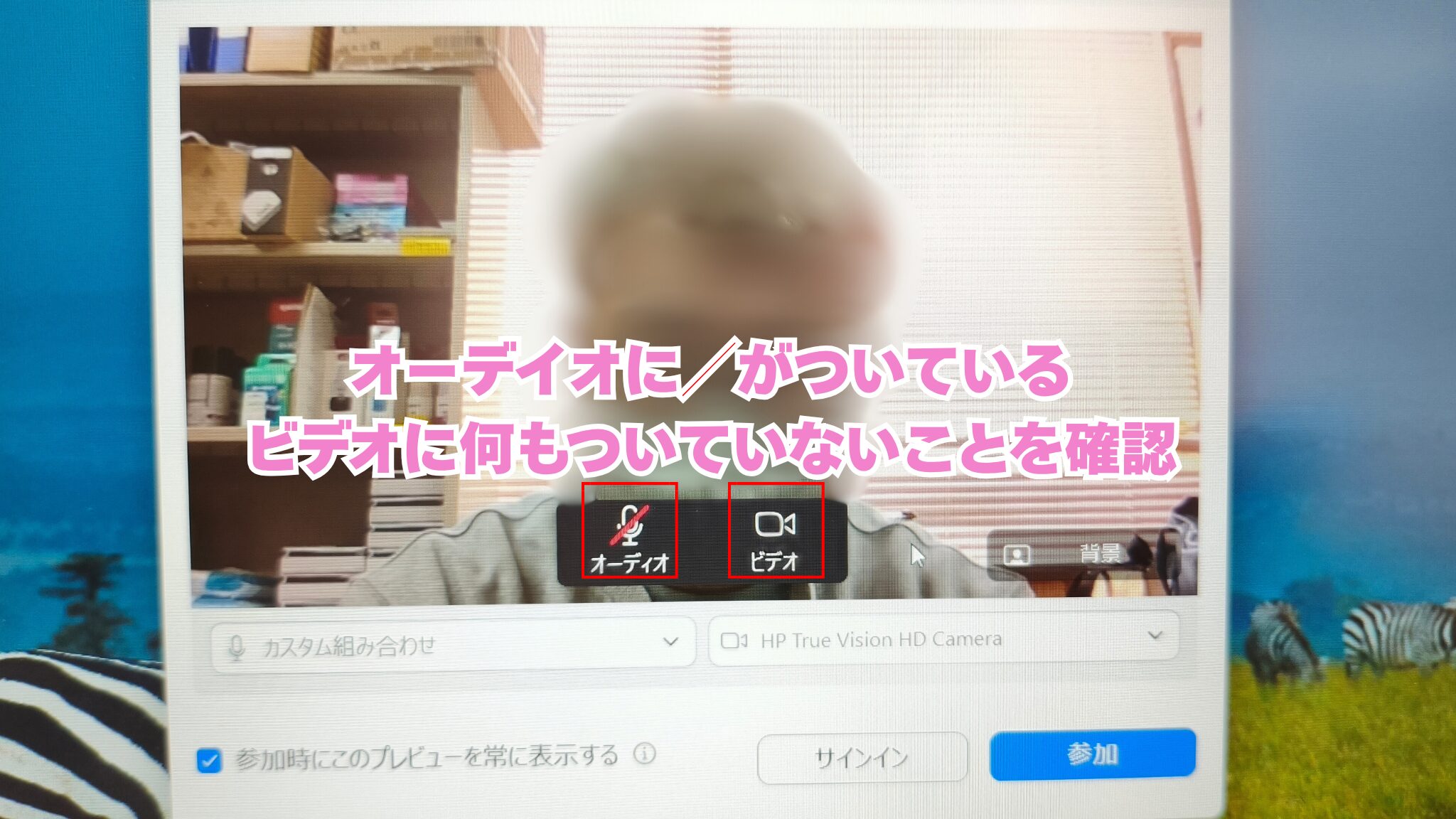 この待機画面では、最初は「オーディオがオン」「ビデオがオフ」になっていることが多いです。