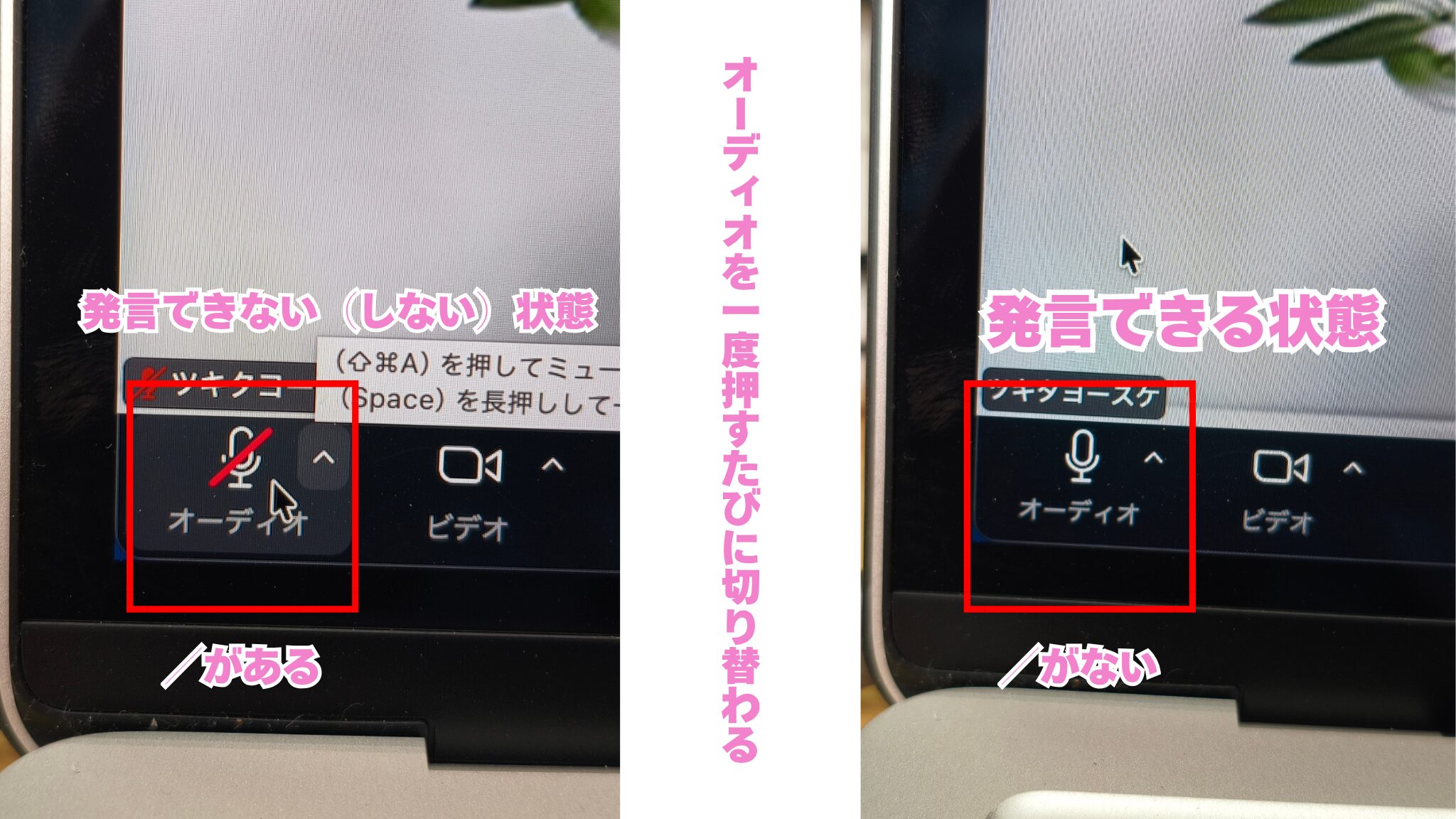 朝礼では「オーディオはオフ」「ビデオはオン」にする必要があります。